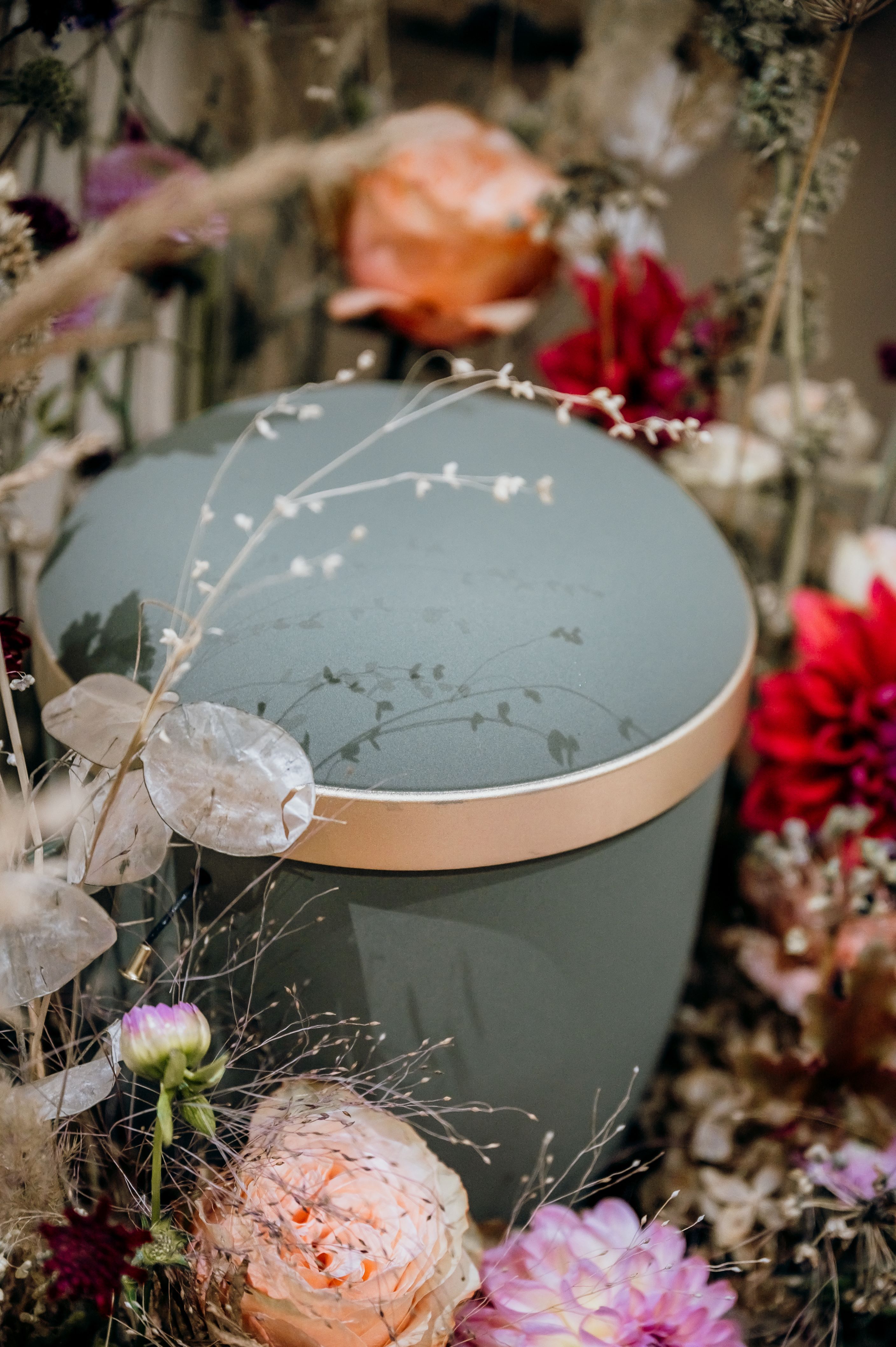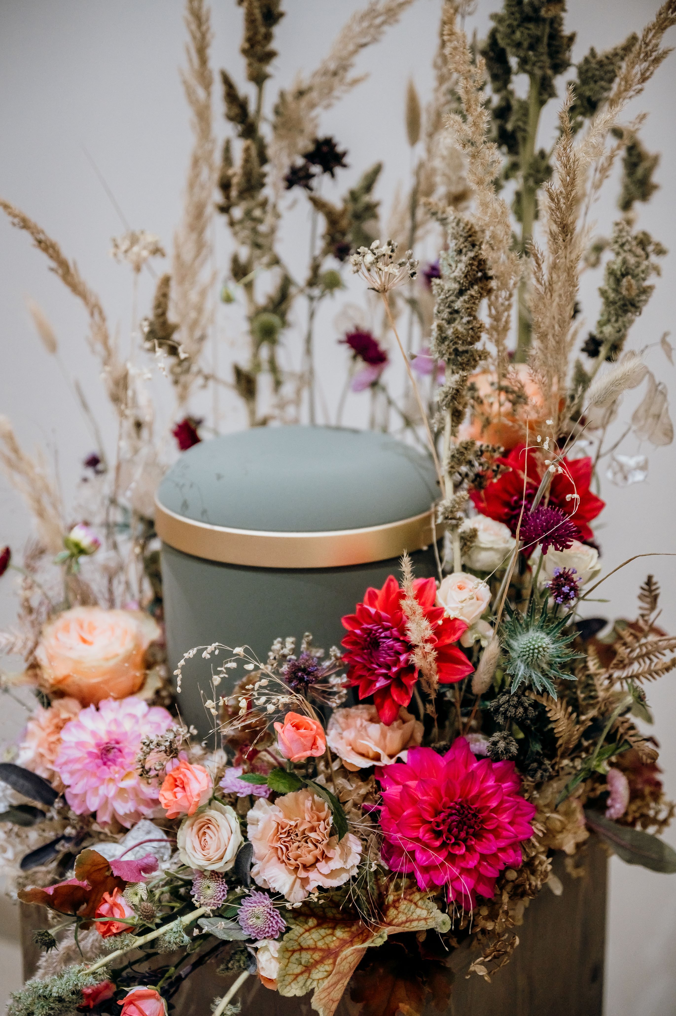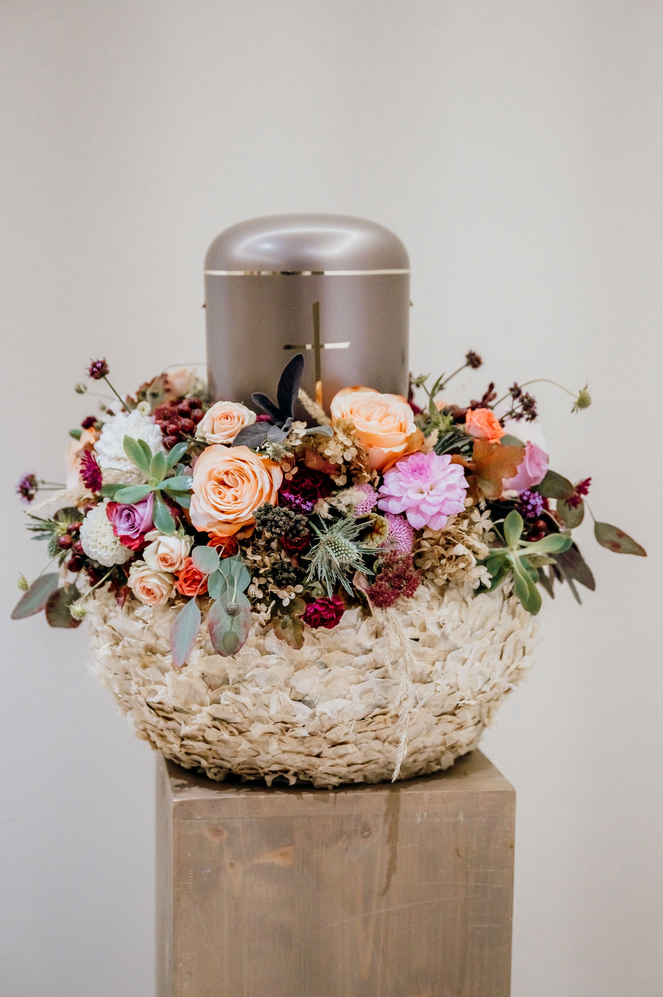 Wenn ein lieber Mensch aus unserem Leben tritt, bleiben uns die Erinnerungen im Herzen. Die Verabschiedung dieser Menschen, gehört zu einem wichtigen Prozess, den wir durchleben müssen, um mit dem Verlust umgehen zu können. Ein Sarg, der geschmückt ist mit den Lieblingsblumen des Verstorbenen wird genauso zu einer Erinnerung, die wir behalten, an den Moment, in dem wir unseren Lieben gehen lassen mussten. Unsere Mitarbeiterinnen gestalten mit viel Feingespür Trauerarrangements, die die Persönlichkeit des Verstorbenen widerspiegeln.